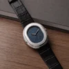 Encircling the dial is a distinctive double-step bezel, featuring a linearly brushed flat surface contrasted by polished chamfers. This architectural detail adds visual structure and enhances the watch’s overall presence despite its compact size.