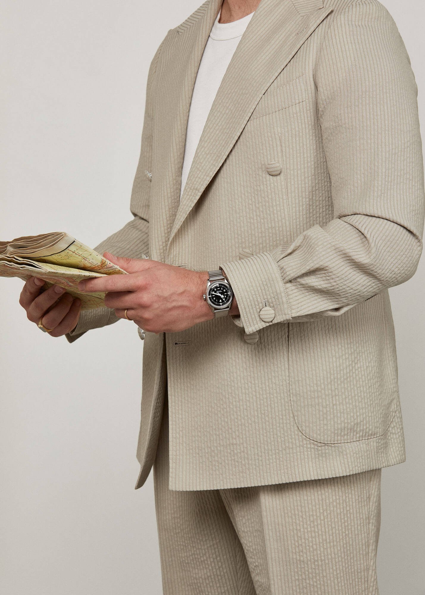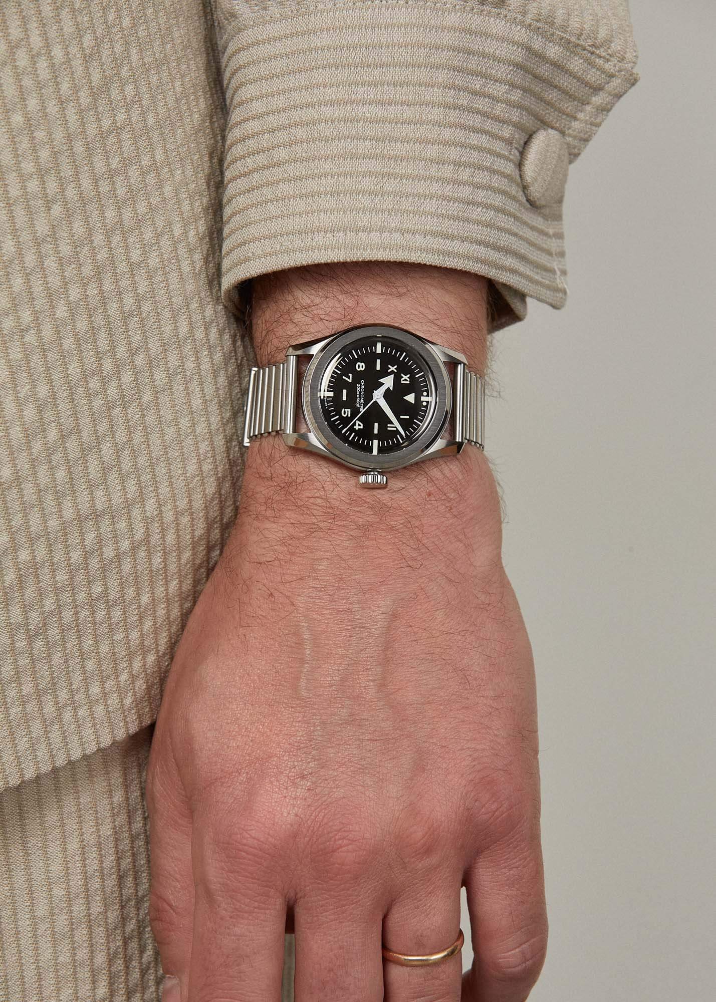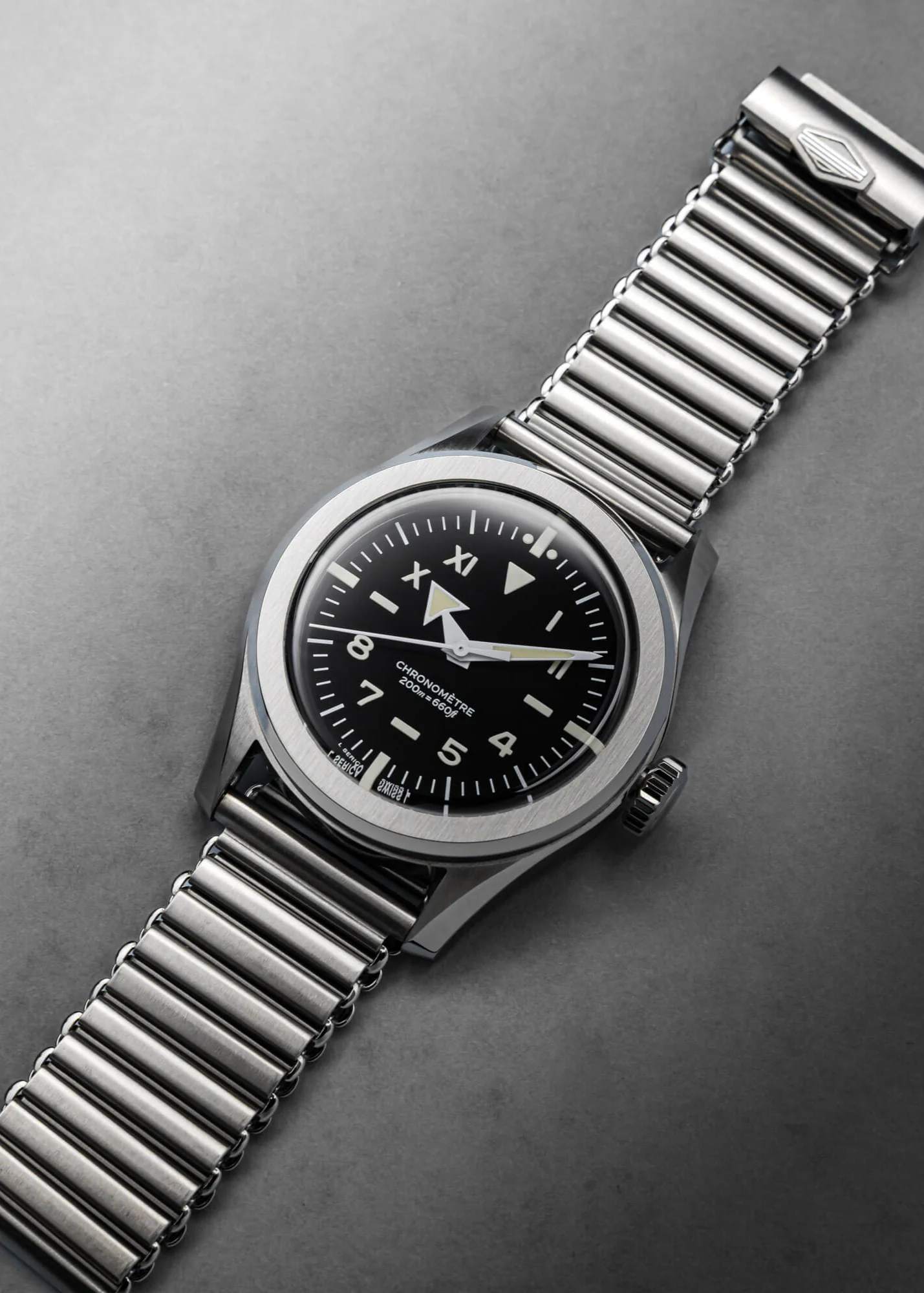 The bezel adopts a distinctive “step” design with a flat surface, manufactured from 316L steel to match the case. Its vertically brushed top is contrasted by polished chamfers, creating a subtle play of light that elevates the watch’s overall aesthetic without overwhelming its clean lines.